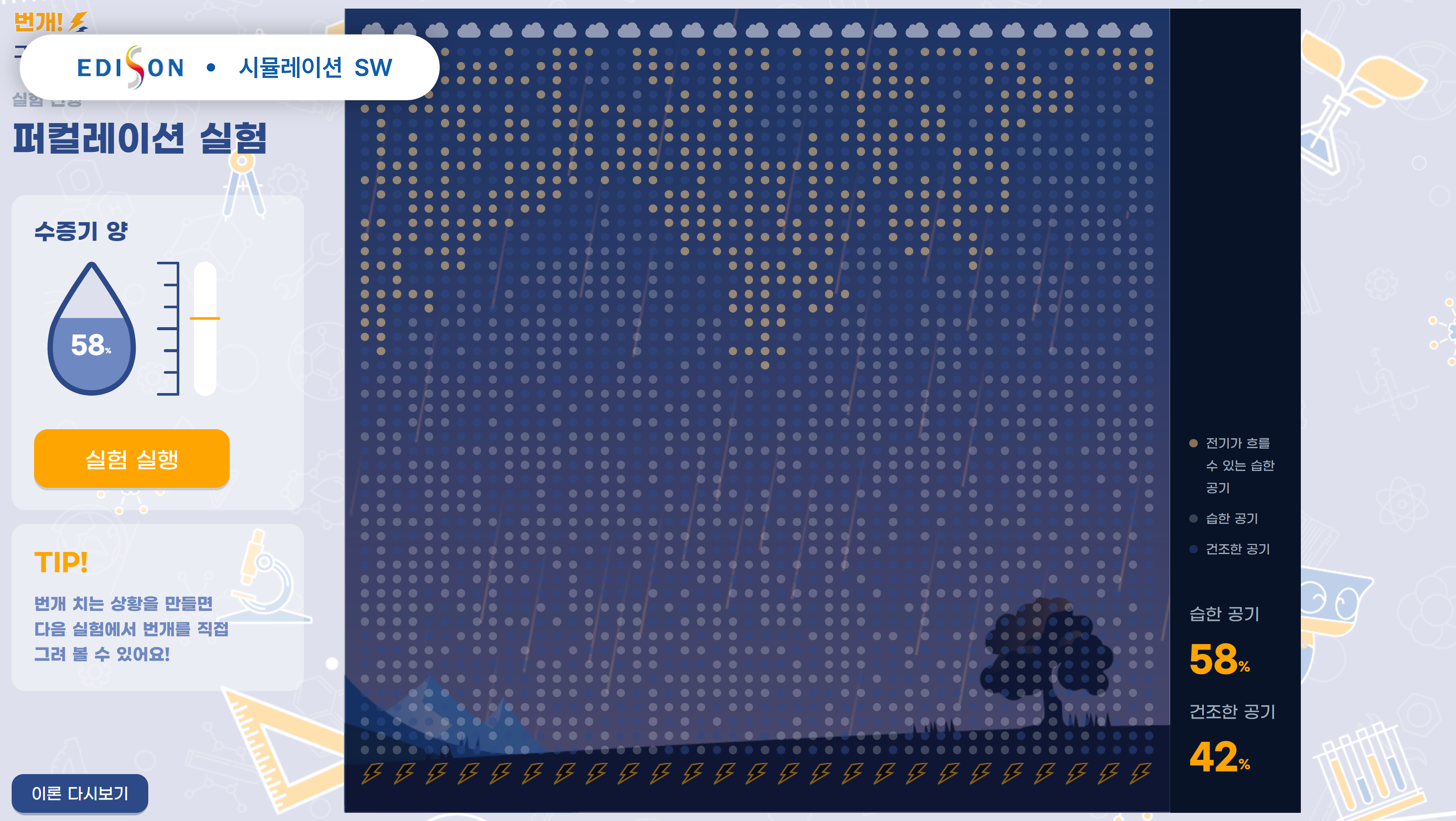 ‘번개! 그것이 알고 싶다.’ 이번 실험에서는 번개 발생 원리에 대해서 알아볼까요? 복잡한 원리를 이해하기 위해서 간단하게 구슬을 가지고 퍼컬레이션 모델을 만들어 봅니다. 대기 중 수증기 양에 따라서 번개가 칠 수 있는 확률이 어떻게 되는지 알아볼 수 있습니다. 실제로 연구원들이 연구할 때 사용하는 퍼컬레이션 모델도 에디슨 홈페이지(https://www.edison.re.kr/)에서 체험해볼 수 있어요!