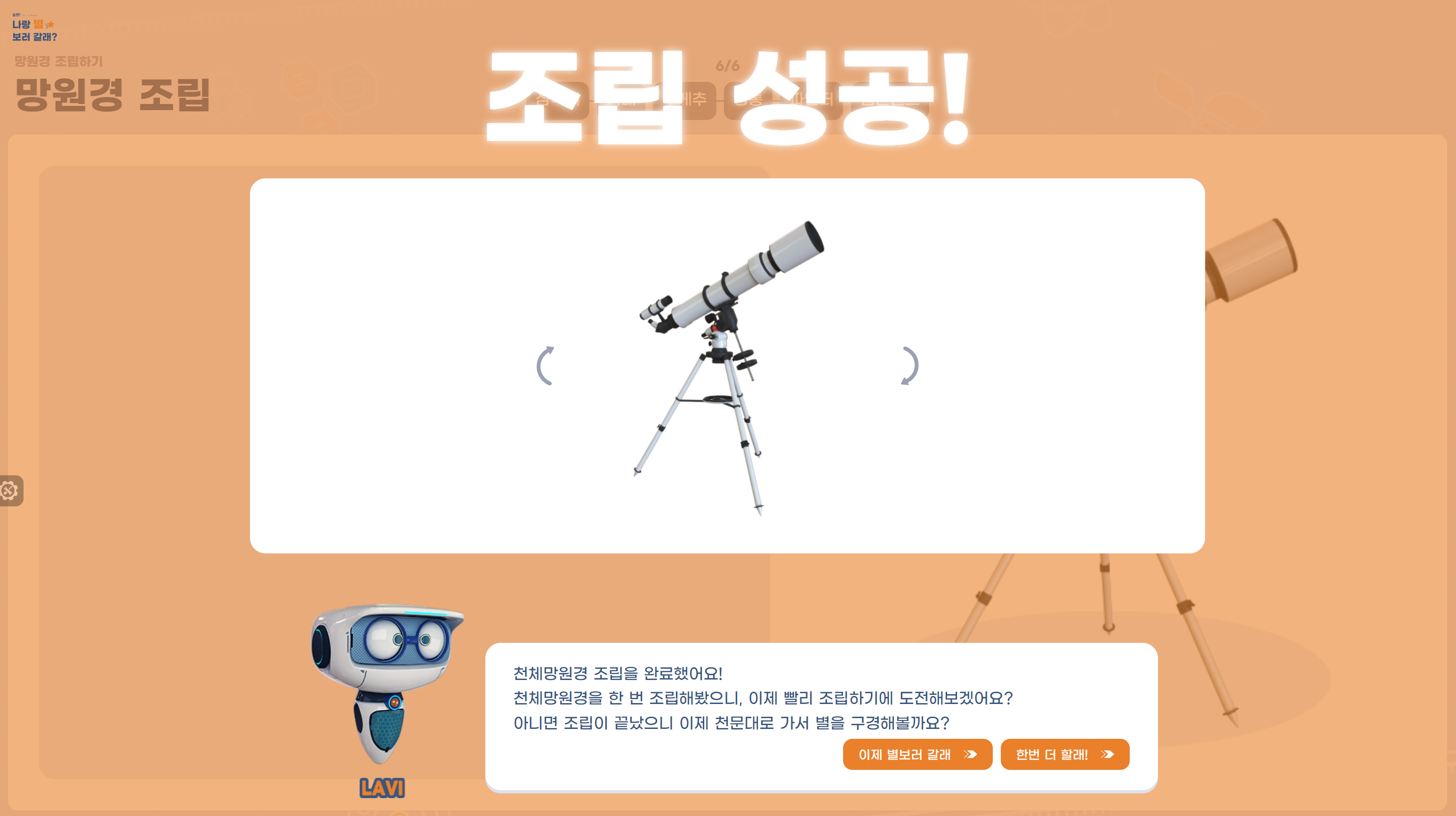 ‘나랑 별 보러 갈래?’ 실험은 가상공간의 천문대에서 천체망원경을 활용하여 천체를 관측할 수 있도록 구현했습니다. 천체망원경의 역사와 원리에 대해 배우고, 라비의 안내에 따라 천 체망원경을 조립, 조작해보고, 직접 천체를 관측하여 사진을 찍고, 전시도 할 수 있습니다. 라비와 함께 별 보러 떠나볼까요?