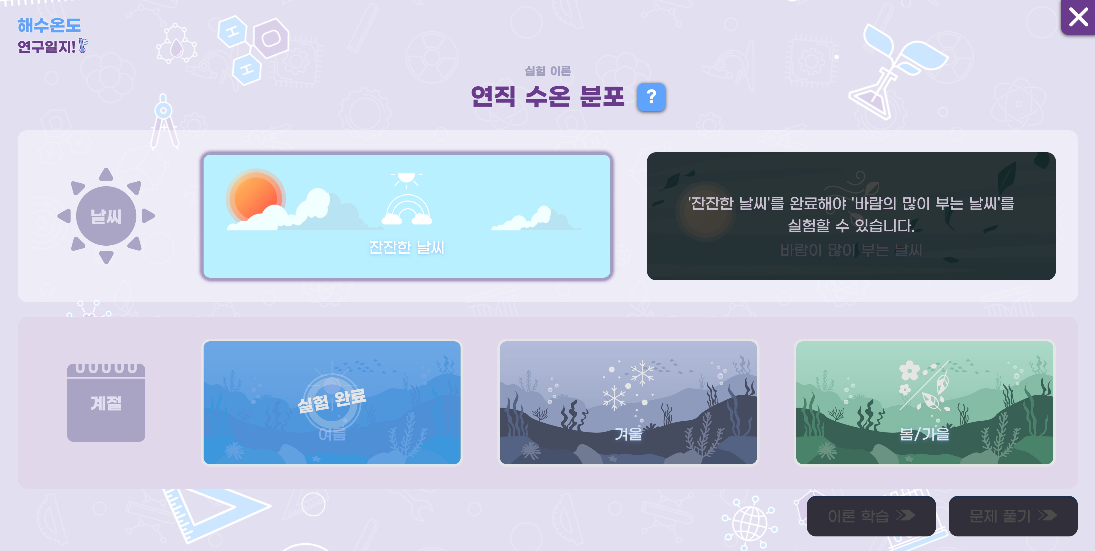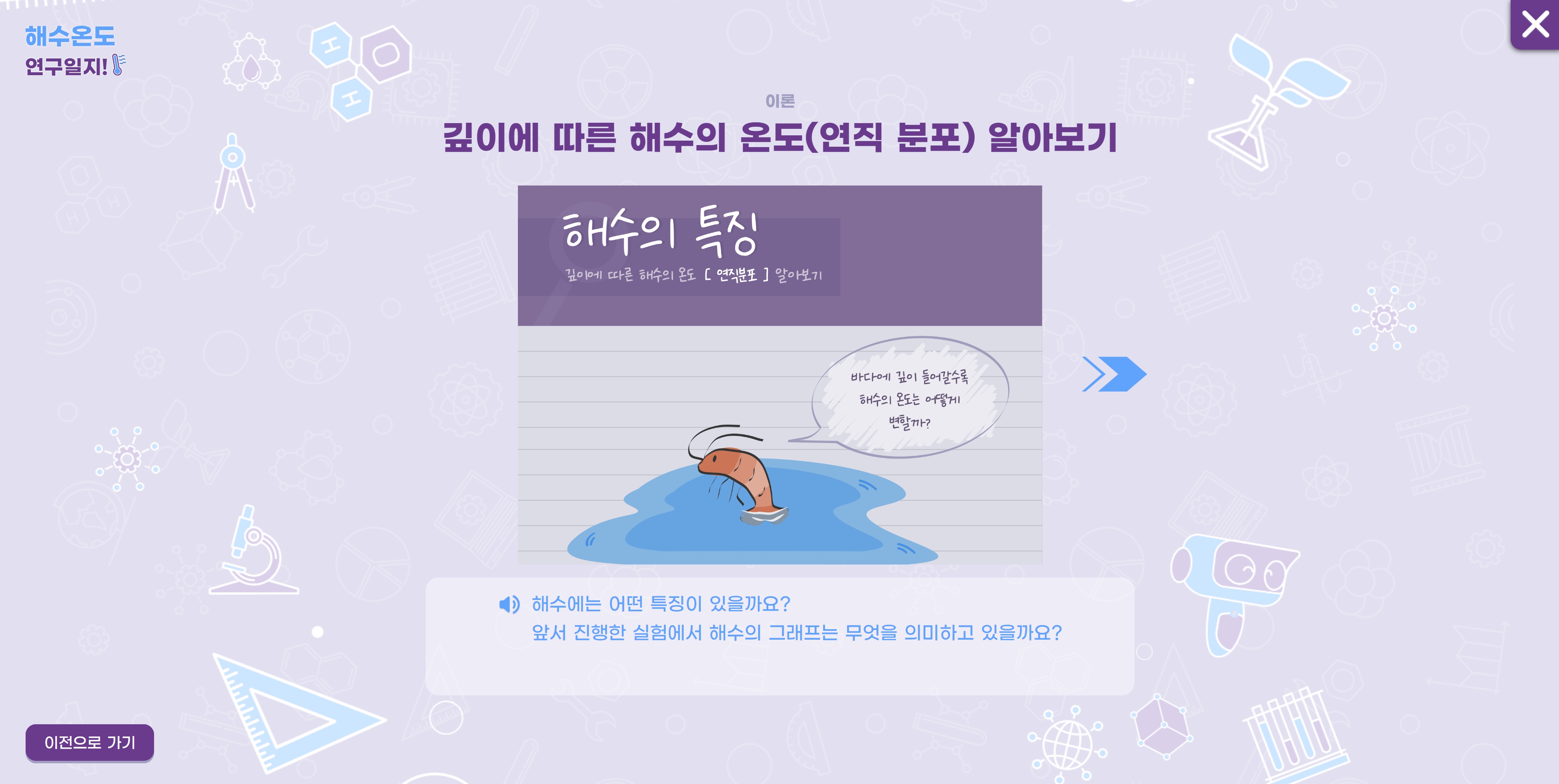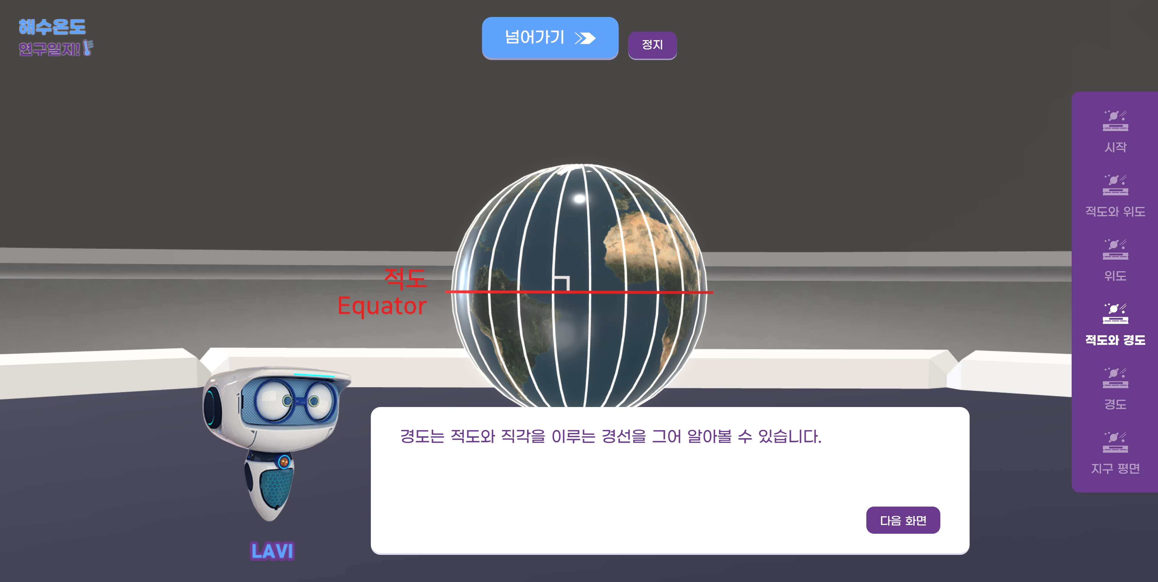 ‘해수 온도 연구 일지’ 가상실험실에서는 라비의 안내에 따라 수평 수온, 연직 수온 학습방에서 조건에 따른 변화와 결과를 탐구·관찰할 수 있도록 설계했습니다.