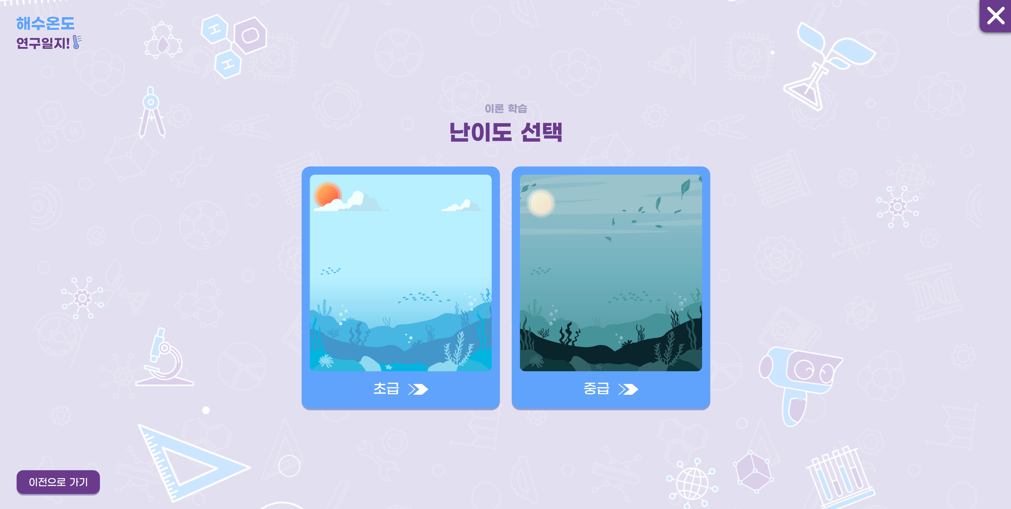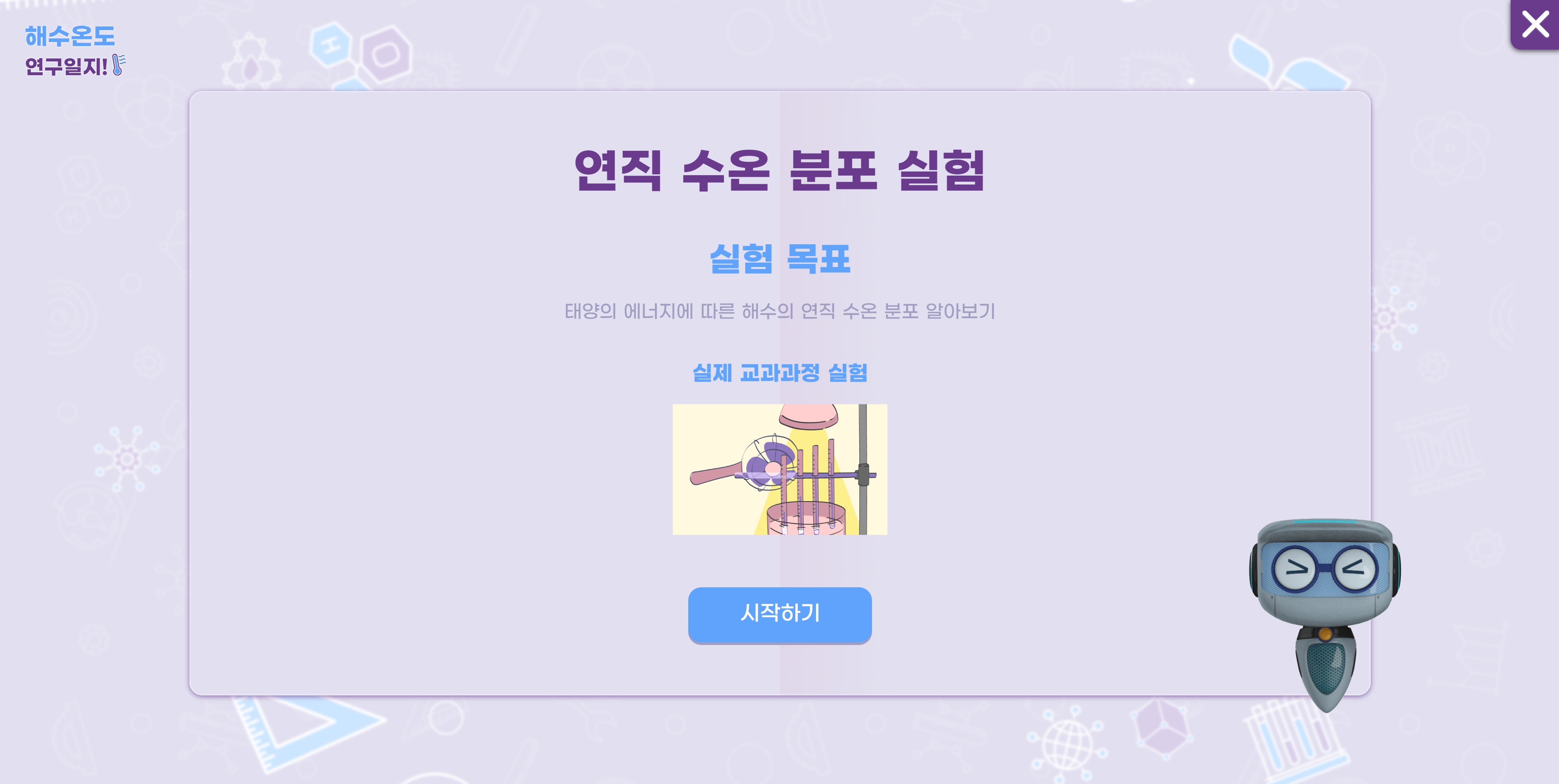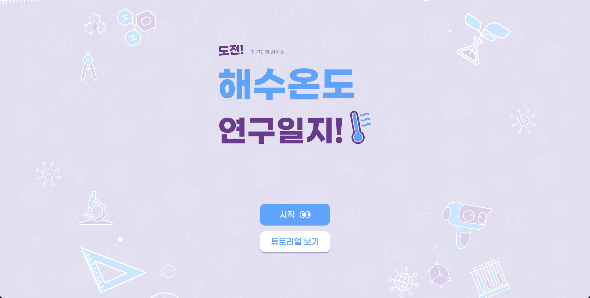 ‘해수 온도 연구 일지’ 가상실험실에서는 라비의 안내에 따라 수평 수온, 연직 수온 학습방에서 조건에 따른 변화와 결과를 탐구·관찰할 수 있도록 설계했습니다.