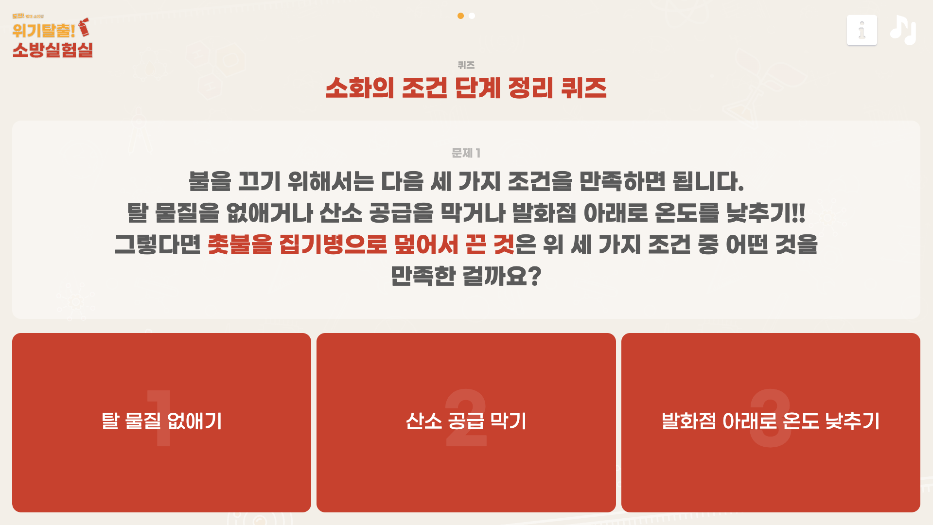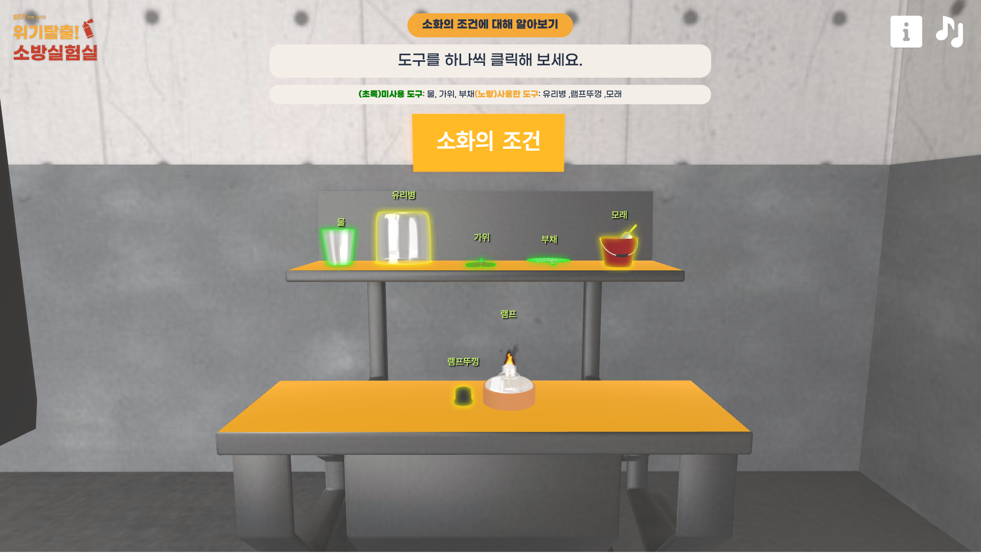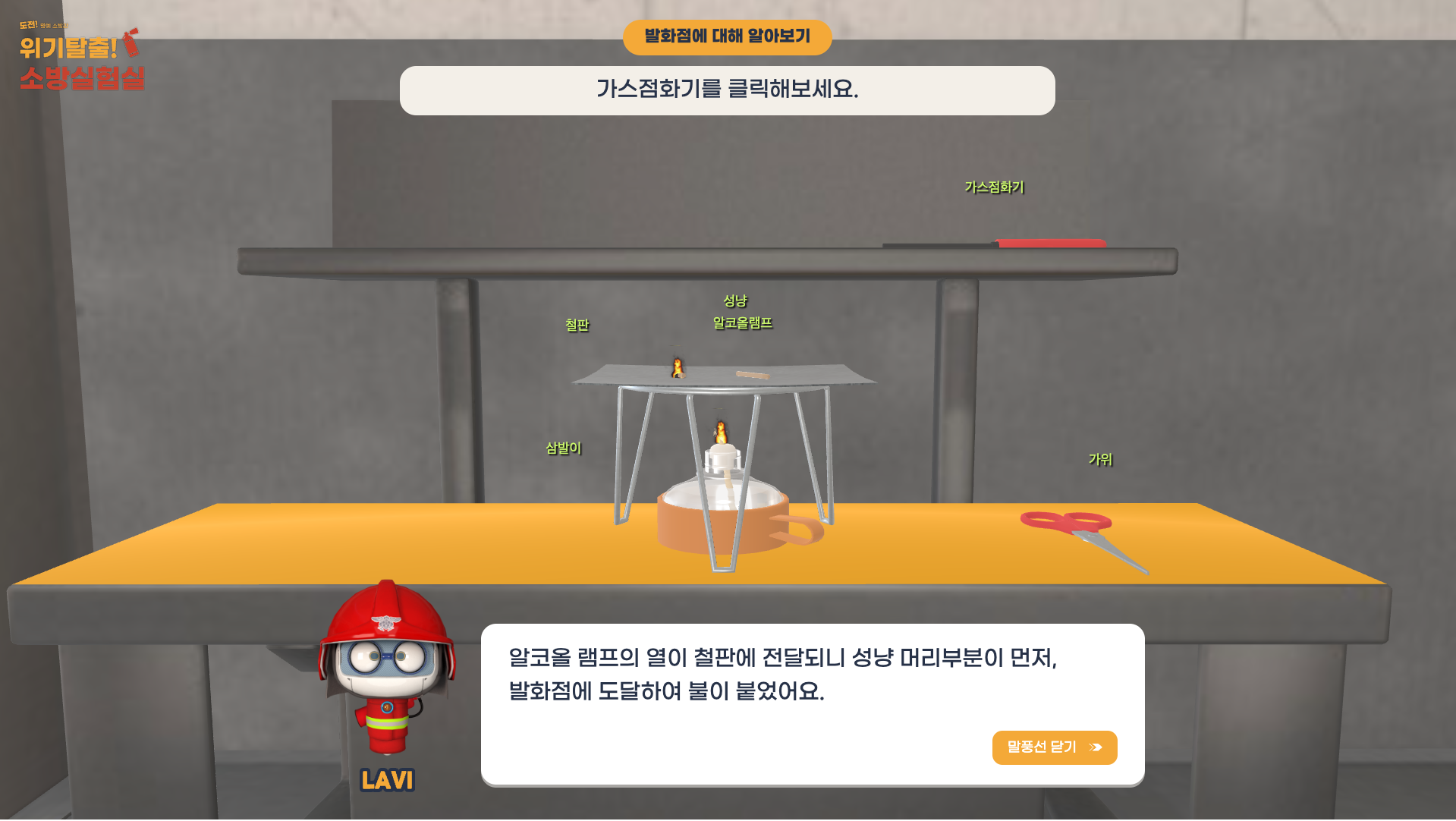 가상실험 ‘위기 탈출! 소방 실험실’에서는 소화와 연소 단원에서 다루는 다양한 실험을 해보고, 이를 활용하여 모의 화재 진압을 안전하게 경험할 수 있습니다.