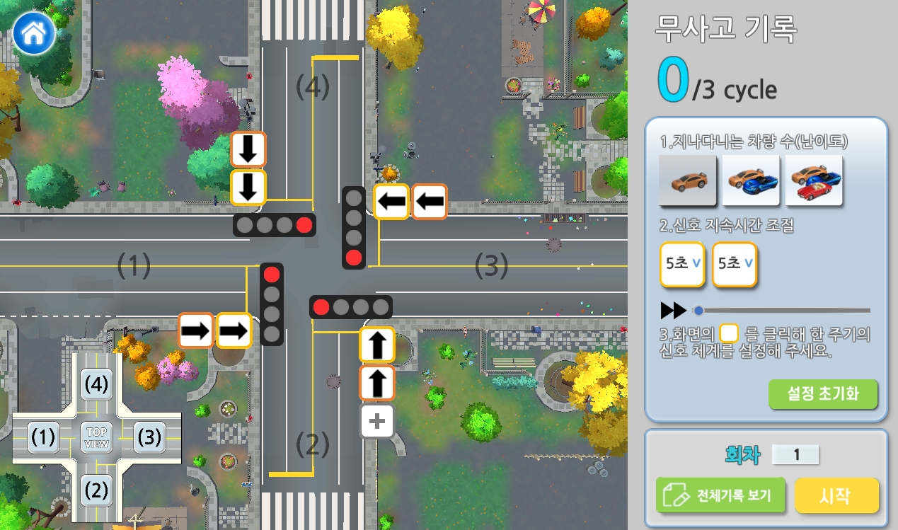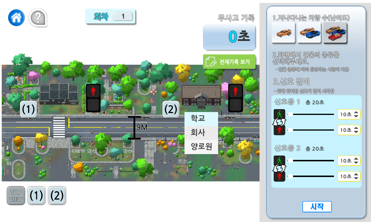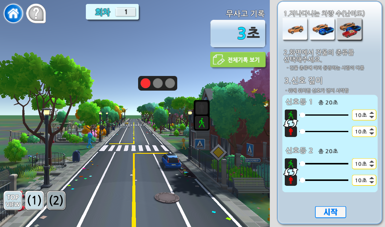 차량 수, 화면 건물 선택(건물의 종류에 따라 등장하는 보행자가 다름), 신호 길이를 조정하며 어떻게하면 보행신호를 효과적으로 설정할 수 있을지 실험해 볼 수 있습니다.