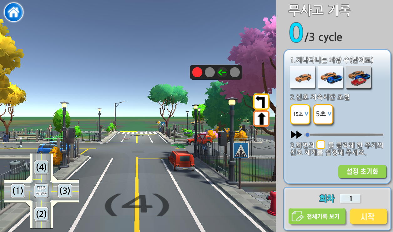 차량수, 신호 방향 설정(직진, 좌회전, 직진 좌회전 동시 신호), 신호 지속 시간을 조정하여 교차로 내에 차량 순환 관계를 실험할 수 있습니다. 주요 요인 설정에 따라 교통현황이 ‘원활/정체/사고’로 나타납니다.