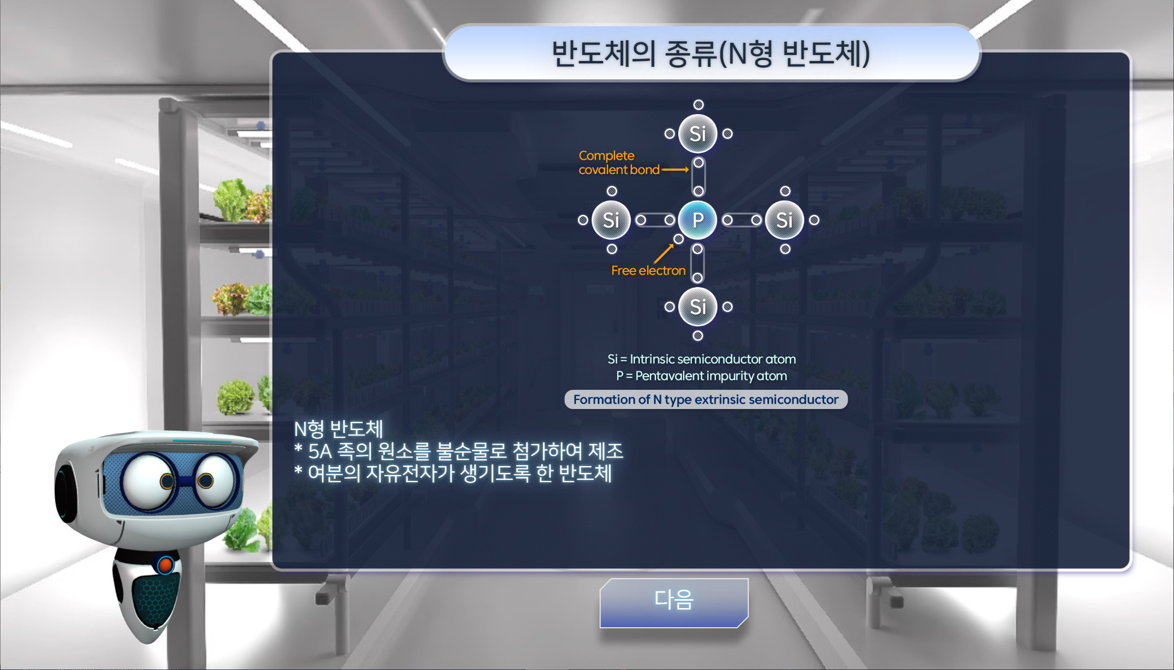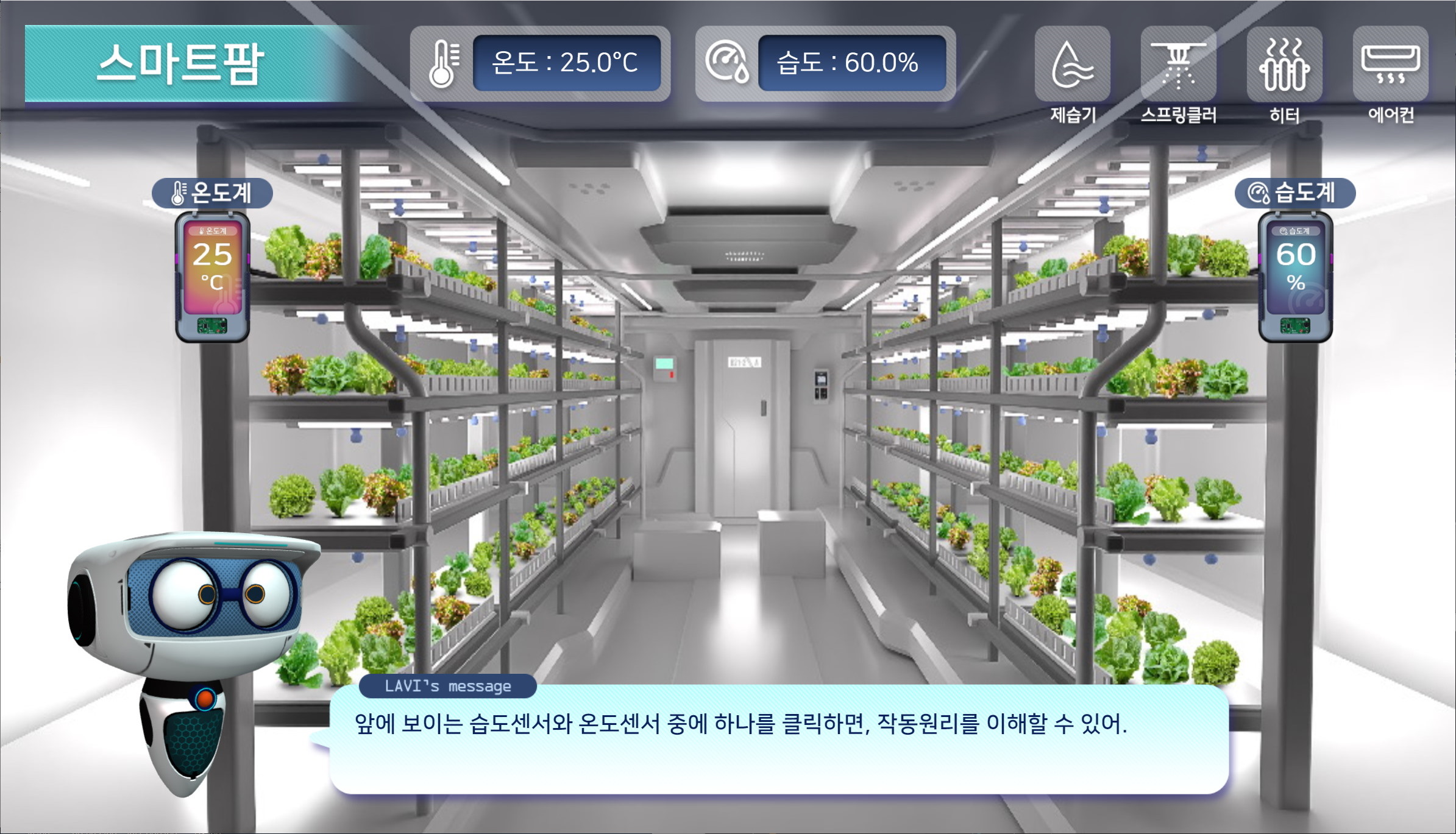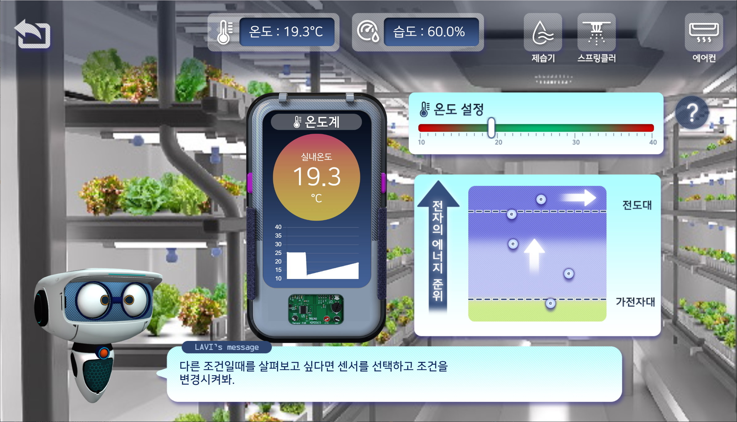 사전 학습을 마친 학생은 스마트팜에 입장하여 온도, 습도 센서가 부착된 스마트팜 내에서 반도체 센서가 어떻게 활용되는지 경험할 수 있습니다. 선택한 센서의 온도 또는 습도를 직접 조절해보고 반도체 센서 내에서 일어나는 변화를 애니메이션으로 보면서 이해할 수 있습니다.